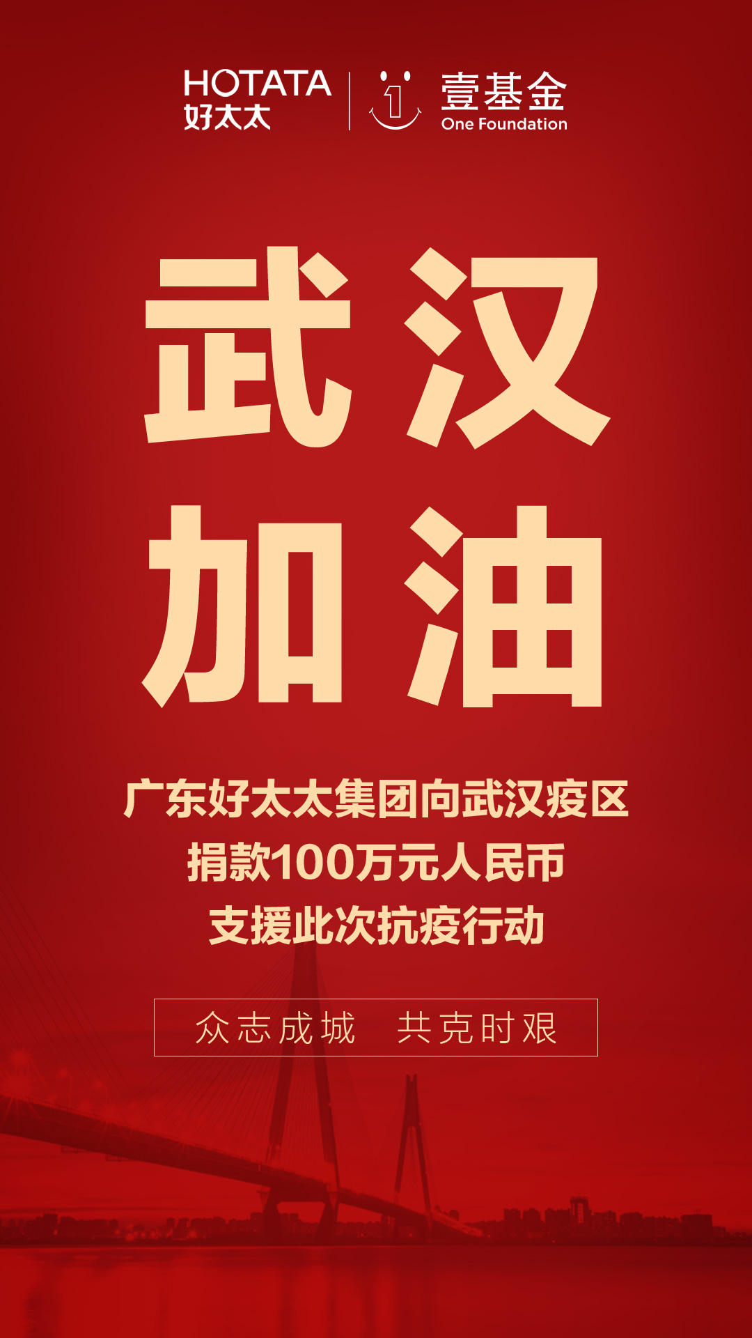 新型冠狀病毒疫情天天都在變化,牽動著每一個中國人的心,疫情當前,舉國抗擊,好太太集團在行動!1月28日,好太太集團攜手壹基金馳援武漢捐款100萬,捐助款項將用于此次肺炎防控的相關措施。