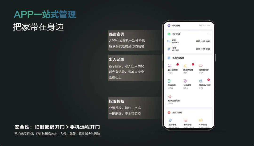 生成臨時(shí)密碼,避免密友門(mén)外等候,權(quán)限管理,一鍵添加或刪除指紋、密碼和磁卡。